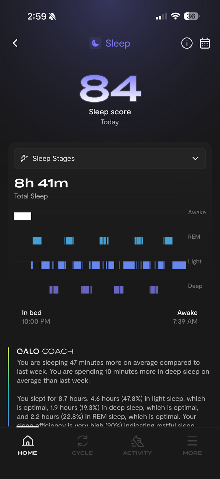 These two numbers reveal how well you're actually using your time in bed. If you're in bed for 8 hours but only sleeping 6, you're leaving recovery on the table. Fast sleep onset usually means your body is primed to recover; long latency can signal lingering stress, too much screen time, or that you haven't wound down enough before bed.